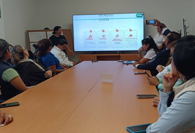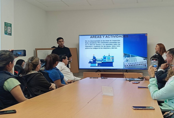En este encuentro, los jóvenes de las carreras de Mantenimiento Industrial, Producción Industrial y Mecatrónica presentaron a directivos, coordinadores, jefes empresariales y padres de familia los conocimientos y habilidades que han desarrollado en su proceso de aprendizaje dentro de la empresa.